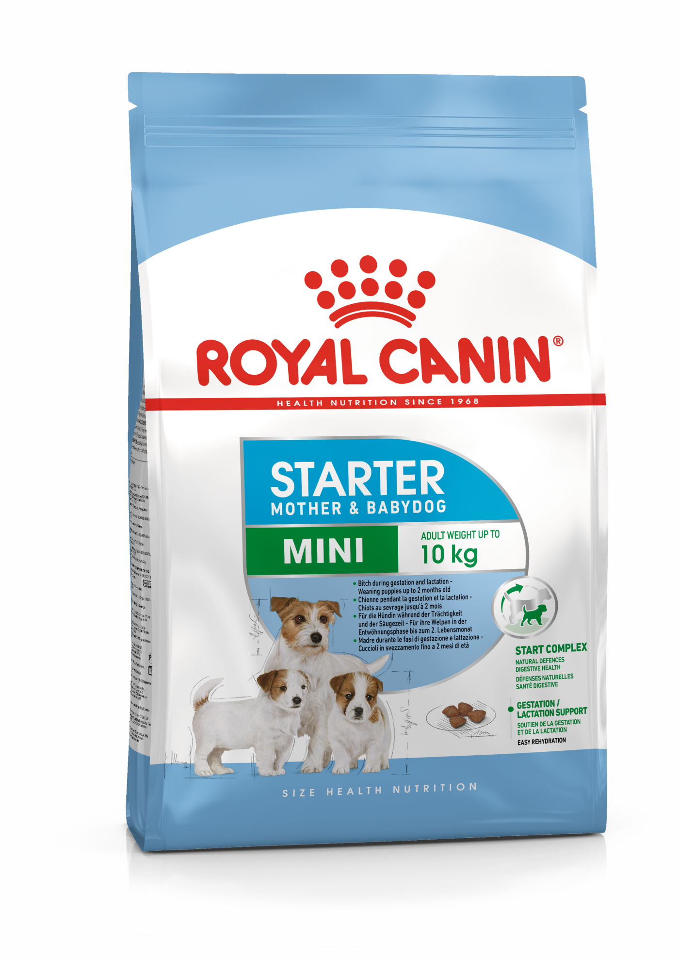 ROYAL CANIN® Mini Starter Mother & Babydog está especialmente formulado para satisfacer las necesidades nutricionales de las madres tras el parto y de sus cachorros. Esta fórmula es adecuada para perras adultas de razas pequeñas que pesan hasta 10 kg y para cachorros en periodo de destete de hasta los 2 meses de edad.